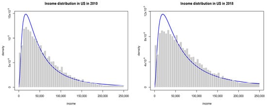 Although in economics income is typically defined as the amount of money an economic agent or household receives on regular basis and wealth is related to the length of time that a family could maintain their current lifestyle without receiving compensation for performing additional work, we treat these two categories as a whole. The primary source of our data on wealth in the U.S. for our empirical examples is the U.S. Bureau of Census and Bureau of Labour Statistics Current Population Survey for Household Income from the years 2010 and 2018. The survey has been conducted monthly for over 50 years, with over 54,000 households selected based on an area of residence to represent the nation as a whole, individual states, and other specified areas. Each family is interviewed once a month for 4 consecutive months one year, and again for the corresponding period a year later. These data are however available only in a binned or aggregated form, so the only available data include the number of households in each bin, mean income, standard error and income limits assigned to each bin. To estimate income or wealth probability density function, we use the entropy-based divergence method and seek a probability density function, that is as close to the uniform distribution as the data sample will permit [,] (see the Appendix A). Results of estimation are presented in Figure 1. In Table 1, we have also gathered Gini coefficients and information criteria, for various distributions from the Creesse and Read (C.R) family [].