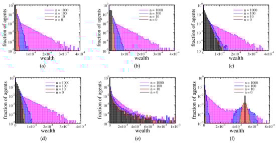 Histograms of agents assets after 0, 10, 100, and 1000 cycles. Different plots correspond to the different initial distribution of wealth among the agents: is (a) equal to , (b) uniformly distributed in the interval [0, 2/N), (c) exponentially distributed, (d) normally distributed, (e) Cauchy distributed, (f) 1% of richest agents possess 100 times more than the rest 99% of agents.