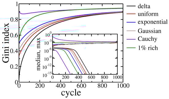 For most of the studied cases, the Gini index grew monotonically with the evolution of the system. The only exception was when initial wealth was drawn according to Cauchy distribution, which is an example of power-law, long-tail distribution. Here, the Gini index started from a relatively high value, as the condensation was an intrinsic property of power-laws. However, after the initial decrease corresponding to recombination to exponential distribution preferred by the model, it started to grow again. It is worth noting that the richest agent in this scenario lost most of its initial assets, but a rapid decrease of the median asset in the population (see Figure 3 inset) shows that wealth condensation occurred anyway. It should be stressed that the final state of these simulations was not stable in either case. The wealth inequalities seemed to grow endlessly. After 1000 cycles the Gini coefficient was above , and the richest agent owned approximately of the total wealth and the median wealth several orders of magnitude smaller.