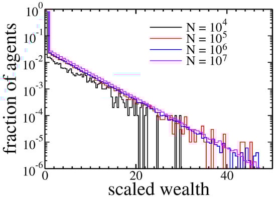 The common factor of all these models is the wealth conservation: , which means that while one agent gains money from a transaction, the other one has to lose some wealth. Therefore, without any preference of richer agents over the poorer ones and due to random character of interactions between agents, these kinetic exchange models can be characterised by a stationary wealth distributions, which exhibit exponential tails. After reaching this distribution wealth, inequalities do not increase anymore. It should be noted that there are also kinetics exchange models that exhibit power-law wealth distribution as a stationary state [,]. These models often assume some preferences of richer individuals; for example, individuals’ wealth is repeatedly multiplied by a random factor, different for each individual.