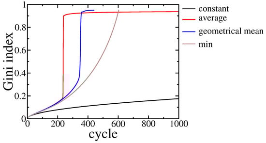 Gini index evolution for different payoff function used in the model. The black line corresponds to constant payoffs while the other ones correspond to payoffs depending on trading agents assets: red—payoff proportional to average assets of trading agents, blue—payoff proportional to geometrical mean of trading agents assets, brown—payoff proportional to poorer agent asset. The parameter and population size .