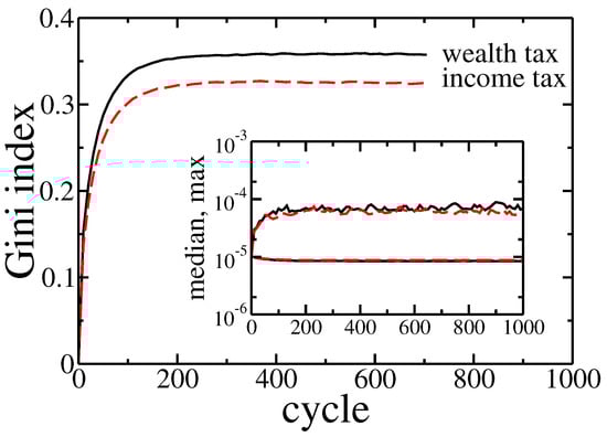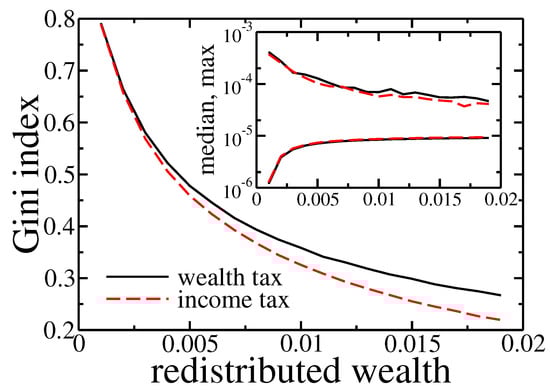In fact there was no significant difference between these two kinds of taxation. The detailed analysis of the Gini coefficient (see Figure 7) suggests that the wealth tax followed to slightly larger inequalities than the income tax. It is in contradiction with above-mentioned, well-established opinions [,,]. On the other hand, this effect is quite easy to explain. Existence of wealth condensation meant that the relation of income to the wealth was effectively higher for richer individuals. Thus, the linear income tax hit the rich more than the wealth tax. However, in a real economy, it is easier to hide or reduce declared income than wealth. Therefore, in general, the wealth tax can be more effective as easier to enforce.
