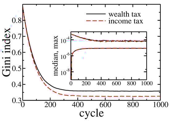 where is an income of i-th agent during one cycle, and and are income and wealth tax rates, respectively. Note that in the above relation we took into account that the global income was equal to r while the total wealth was normalised to 1. Due to the latest opinions that only wealth tax can lower wealth inequalities [,,], we are particularly interested in comparing these taxes within our model. Therefore we studied two different situations—pure income tax with tax rate set at ( and ), and pure wealth tax with rate set at ( and ). For such choice of rates causes redistribution of of the global wealth per cycle in both cases. In general, to get the same global income from the wealth tax and the income tax, the ratio of their rates should be r. The comparison of both cases is presented in Figure 6.