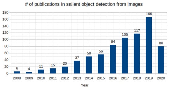 - This is an attempt to cover most of the influential contributions in the past 20 years for SOD in images. Data from Google scholar advanced search with the search constraint as salient object detection from images is collected. The rise of research work as shown in Figure 2 is an indicative of the importance and usefulness of SOD in the current scenario. The present review includes 41 and 50 publications discussed from conventional and deep learning-based SOD, respectively with the aim to help readers to make a broad view of the field necessary to explore future directions for research in SOD.