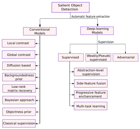 - Deep learning-based SOD models are categorized based on the level of supervision during the model training. The arrangement of the most recent developments in categories of supervised, weakly-supervised, and adversarial learning is useful in understanding the key design issues of SOD models. Figure 3 presents the classification for conventional and deep learning-based methods presented in this work.