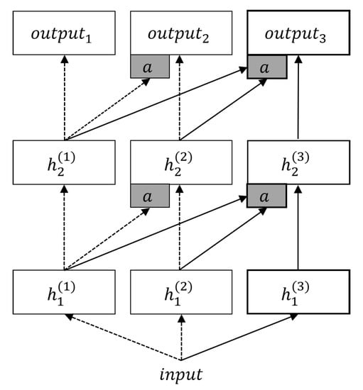 A progressive neural network (PNN) model was proposed by Rusu et al. []. Parameters of a network trained by previous tasks are fixed to prevent catastrophic forgetting. When training a new task, PNN introduces the experience of previously learned knowledge by taking the output of the previous network into consideration. The structure of PNN is shown in Figure 3. PNN retains the structure that has been trained to protect the performance of the model on the old task and effectively alleviate catastrophic forgetting. However, the number of parameters will gradually increase as tasks increase, and the design of different tasks requires manual intervention.