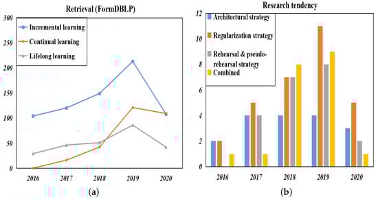 Articles and reports about incremental learning methods from DBLP and the Web of Science were retrieved up to May 2020. This systematic review was done based on the following procedures: (i) relevant keywords are input into specific databases, and retrieval is performed; (ii) repeated works are removed; (iii) each work is grouped based on a set of defined indicators, such as scenario, principle and method type.