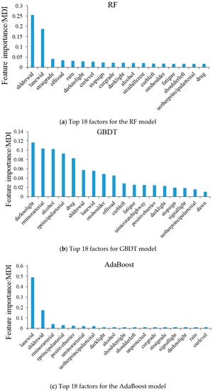 Since the mixed logit modeling results (see Table 3) indicate that there are 18 significant crash risk factors, for comparison purposes, only the top 18 most important risk factors were selected for each ML model, as presented in Figure 1.