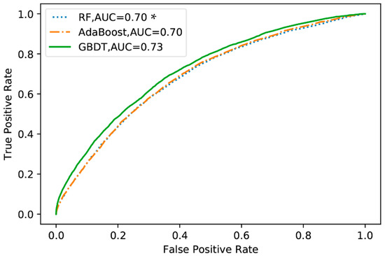 The correlation analysis results in Table 4 implies that, compared with the RF and AdaBoost models, the results of the GBDT model are more correlated with the results of the mixed logit model. Therefore, if we choose an ML method for preselecting the independent variables for the mixed logit model, the GBDT model should be chosen because it can better identify important variables for the mixed logit model than the other two models. In addition, according to Figure 2, the area under the ROC curves (AUC) of the GBDT model is greater than those of RF and Adaboost, which indicates that the GBDT model has better prediction performance than the other two models. Thus, the GBDT model is selected for comparing with the mixed logit model for analyzing the impacts of the identified crash contributing factors.