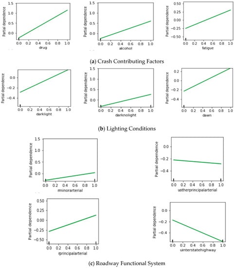 To examine complex risk patterns of large trucks, partial dependence plots were constructed. A partial dependence shows the dependence between the outcomes (crash severity levels) and a set of crash contributing factors; it indicates the marginal effect the factors have on the predicted outcomes [31]. The partial dependence plots of the top 18 factors are presented in Figure 3.