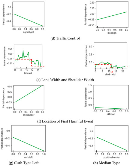 From these partial dependence plots, the impacts of the dependent variable on the independent variable can be analyzed according to the direction of the plotted lines. More specifically, if the partial dependence increases with the increase in the value of an independent variable, this independent variable has a positive effect on the dependent variable, and vice versa. In addition, the slopes of the plotted lines indicate the magnitudes of the impacts. Comparing with the mixed logit model, the advantage of the GBDT model is that it can reveal nonlinear relationships between the numerical independent variables and the dependent variables. For example, as shown in Figure 3e, the impact of lane width (lanewid) does not decline in a straight line; instead, it roughly shows a piecewise decline with spikes at some points that may be due to some random factors.