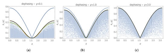 For this quantum statistical model, the Holevo bound has to be evaluated via Equation (34), as the model is neither asymptotically classical nor D-invariant. In particular, as in the previous examples, we started by considering diagonal weight matrices . The optimal maximizing depends on the initial state of the qubit , and in particular on its angle . Remarkably, we have strong numerical evidence that, in the limit or , we have , which is exactly equal to the square of the corresponding renormalized difference between Holevo and SLD-bound. We have also generated random generic (non-diagonal) weight matrix and, as one can see in Figure 1, we obtain that optimizing over diagonal is enough to obtain ; that is, in general, one obtains values of smaller than the one optimized on diagonal-weight matrices (we also notice that is not optimal at fixed ). Moreover, we also observe that and share the same qualitative behavior as a function of the parameters and . However, we also observe that, for small values of the dephasing rate , is strictly smaller than ; that is, the quantumness parameter seems to overestimate the incompatibility of frequency and dephasing. Only by increasing can we find that the gap between these two quantities goes to zero for all values of (in particular, we find that this is already the case for ). In the limit of , the optimal weight matrix becomes the identity , a choice that is equivalent to weighting the parameters according to the Bures metric (in this limit, the ratio between the two diagonal non-zero elements of the SLD-QFI matrix goes indeed to one).