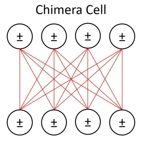 The machine we use, D-Wave’s open-system quantum annealer, is located at the USC-Lockheed Martin Quantum Computing Center. The processor represents an Ising Hamiltonian using an array of superconducting flux qubits with programmable interactions []. The qubits are implemented using Superconducting QUantum Interference Devices (SQUIDs) composed of elongated Niobium loops. The loops and Josephson junctions control quantum annealing and compensate for slight differences between the physical properties of any two SQUIDs due to fabrication variations. The qubits are divided into 8-unit chimera cells, which have four qubits arranged horizontally and four vertically such that each qubit intersects orthogonal qubits. At these intersections a SQUID is placed to control the magnetic coupling between the corresponding horizontal and vertical qubits within the same cell. This architecture results in a coupling graph that is fully bipartite at the cell level. The processor is composed of cells joined together in a square lattice such that the horizontal qubits in one cell are coupled to the horizontal qubits in the neighboring cells to the right and the left, and the vertical qubits are coupled to the vertical qubits on top and on the bottom. This creates a Chimera graph ( Chimera graphs have cells and L-sized partitions with units per cell. The DW2X implements a Chimera graph with 1098 working qubits.).