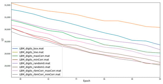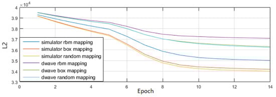 Though the exact form of R varies according to specific needs, determining the proper value of the term is typically achieved through an empirical tuning process [,,,]. As it stands, our approach separates entropy from the regular LBM training and weight update process into two steps: we first update network parameters normally, without consideration of entropy, then evaluate the entropy of our mapping and potentially reassign variables to qubits. We believe it possible to treat entropy as a regularization term and directly include it in the weight update process, explicitly tuning to find good qubit mappings.