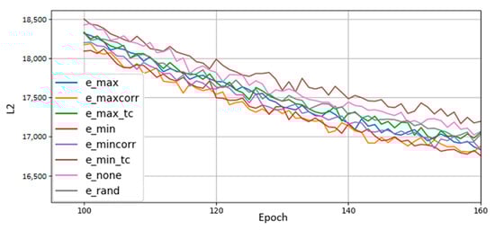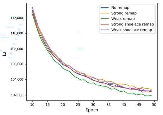 Figure 8 plots the reconstruction losses of various BMs trained with different remapping policies. Remapping occurred after epochs 0, 5, 10, and 15, after which there was no more qubit remapping. Training continued until epoch 200. From the results, we conclude that a policy that reduces entropy, but does not minimize it completely, performs best. We also observe that although we remap qubits early in training, the effects of remapping persist long after dynamic remapping ceases. Of particular note is the amount of training time saved. Directly comparing loss values against each other is not illuminating because we do not know the lower bound on L2 achievable by the BMs; however, what we can do is compare the number of epochs necessary for each qubit remapping policy to match the others. For instance, the loss value obtained by the no-remapping policy at epoch 200 is the value achieved by the greedy entropy policy by epoch 160—the greedy entropy only took the training time to get the same level of performance. This result is attributable to remapping changes we made early in training. Our choice of qubit remappings in the first 15 epochs (totaling only 4 remappings) persisted through the entirety of training and led to a disproportionately large performance gap between policies. No qubits were added or removed and no hyperparameters were altered, so we can point to a qubit remapping policy as the sole factor driving performance differences.