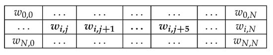 The parameter space qubit i is allowed to explore. Shown is a matrix of weight values. Qubit i’s connectivity is limited to merely 6 other qubits, which we conveniently listed as qubits j through , so the possible space is quite small. Only the bolded parameters can be changed under a static mapping method, whereas a dynamic mapping method can alter any weight parameter such that .