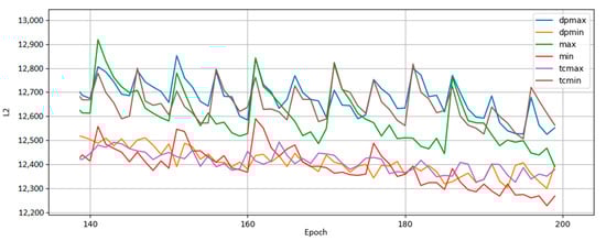 Results from a BM trained on MoS2 data run where qubits are remapped every 5 epochs throughout training. The policy rankings (greedy policies “min” and “max”, greedier policies “dpmin” and “dpmax”, and total correlation policies “tcmin” and “tcmax”) hold steady across data sets, suggesting the usage of entropy as a metric for remapping decisions may be a generally good idea regardless of the input data. The upward spikes of L2 occur every 5 epochs upon remapping.