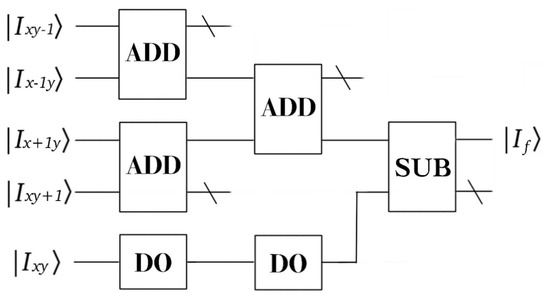 At last, the output . One obtains the pixel value of the neighborhood by cycle shift operation, and then calculate the gradient according to Laplace’s template, where a quantum black box is designed to compute the gradient of the Laplace operator, in Figure 2.