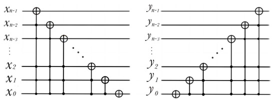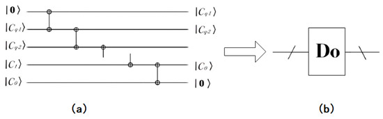 If one wants to shift the binary sequence to the right by this, one obtains . In order to form a sequence of qubits, add an auxiliary qubit , then obtain . The realization process of the quantum circuit of double operation is shown in the Figure 6.