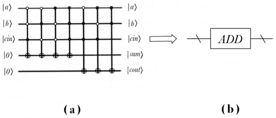 Realization of quantum circuit of adder and simplified model. (a) The concrete quantum circuit of adder; (b) Simplified model of adder.