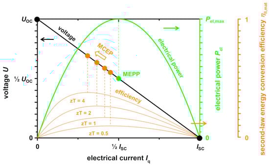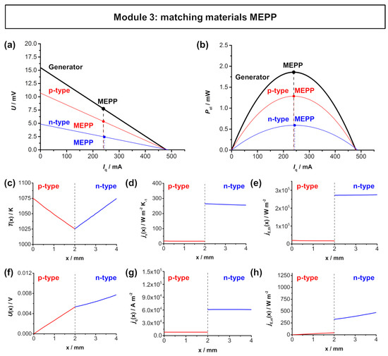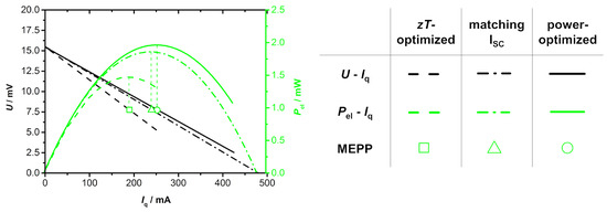 The maximum power output of a TE module is a function of the electrical current Iq of the module at the MEPP Iq,MEPP,TEG and the voltage U of the module at the MEPP UMEPP,TEG, which are calculated according to Equations (A8) and (A9):