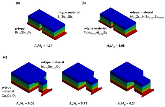 Resulting modules characterized via finite elemente simulations (FEM)-simulations. (a) Bi2Te3-based TE module 1, (b) half-Heusler-based TE module 2, and (c) oxide-based TE module 3 with three different An/Ap ratios. The colors refer to the respective temperatures (red: hot side, blue: cold side). Note that the effective area An + Ap is constant for all modules and An/Ap ratios. As connector, the characteristics of copper has been used in the simulation.