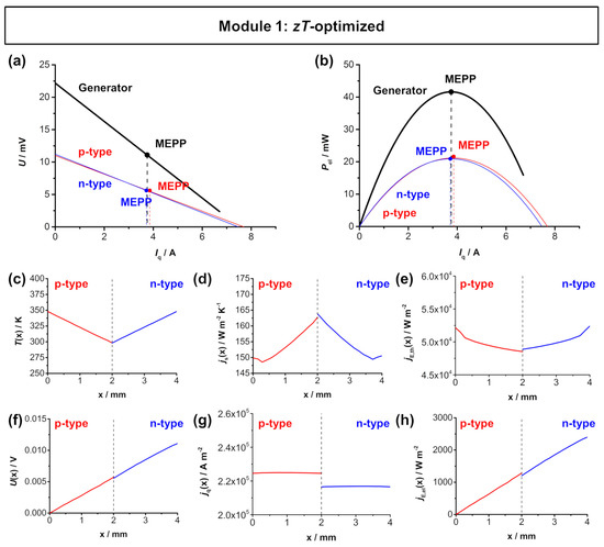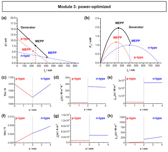 Finally, in Figure 7, the power optimization of the An/Ap ratio according to Equation (7) is shown. Again, the material working points do not overlap, but as a result of the increasing cross-sectional area of the n-type In1.95Sn0.05O2, the electrical power output of the the n-type material is significantly higher compared to the other two optimization strategies. In fact, both materials reach a similar electrical power output Pel,max of about 1 mW, resulting in a maximum electrical power output Pel,max,TEG of about 2 mW for the module. This corresponds to a maximum electrical power density el,max,TEG of 5.89 mW cm−2. The individual fluxes within in the p-type and n-type thermolegs for the power-optimized module are shown in Figure 7c–h. Here, the trend from the module optimized for matching Iq,SC continues. The larger area of the n-type material results in a higher voltage U(x) and as well as decreasing flux densities of entropy jS(x) (slightly lower) and charge jq(x) (significantly lower).