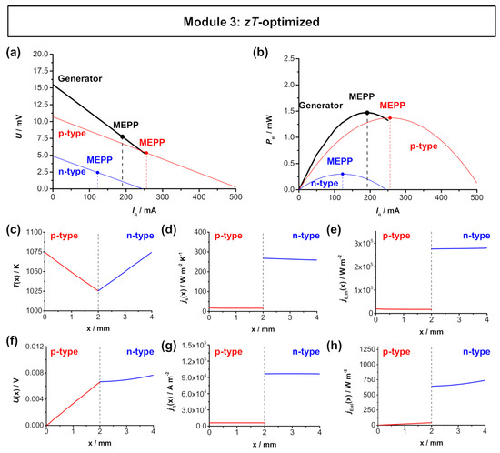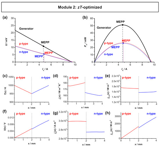 Analogous to the Bi2Te3-based module, the materials exhibit similar thermoelectric properties and the resulting An/Ap ratio is still near 1. For the simulations, the zT-optimized An/Ap ratio of 1.08 was used. The material working points also show a good overlap as a result of the zT optimization. Therefore, the module’s MEPP and MCEP are also close together. The TE module reaches a high electrical power output of approximately 51.1 mW. With an effective area of 0.334 cm2, this corresponds to a similarly high maximum power density el,max,TEG of 153.14 mW cm−2, which is slightly higher compared to the Bi2Te3-based module 1. The individual fluxes within in the p-type and n-type thermolegs are shown in Figure 4c–h. The temperature is set to be 1000 K at the hot side and 950 K at the cold side. At the applied 50 K temperature difference, a voltage U(x) of 10.54 mV can be reached, which is slightly lower compared to the Bi2Te3-based module, as a result of the slightly lower Seebeck coefficient of the n-type material. The entropy flux density jS(x) of the p-type is slightly higher when compared to the n-type thermoleg, due to the higher thermal conductivity of the p-type material. Analogously, the electrical flux density jq(x) is also slightly higher in the p-type material, due to the higher electrical conductivity of the p-type material. In one thermocouple, a thermal energy flux density jE,th(x) of 16 × 103 W m−2 and an electrical energy flux density jE,el(x) of 2.9 × 103 W m−2 are reached, both being higher when compared to the Bi2Te3-based module, due to the higher values of electrical and thermal conductivity of the respective materials.