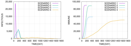 The charts show the dynamics of epidemic for four scenarios: (1) , ; (2) , ; (3) , ; (4) , . The population size is , the mean node degree is , the expected duration of the infectious period is in all four cases presented in the figures. (Left) The number of infectious agents as a function of time t expressed in days from the beginning of the epidemic. (Right) The number of immune agents: , where , and are the numbers of infectious, recovered and susceptible agents, respectively. For scenario 1, the herd immunity level is reached in days. In scenarios 2, 3, 4, the herd immunity levels: are reached in: days, respectively.