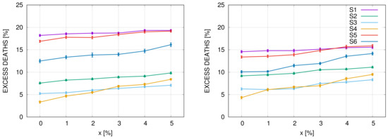 As the next example, we compare in Figure 4, additional deaths days after the outbreak for all six scenarios in the systems ‘PL-V2’ and ‘US-V2’ which simulate hypothetical situations of the doubled capacity of the healthcare systems in Poland and the USA. The slope of the graphs increases with the duration of the epidemic as additional deaths from causes other than Covid are increasing with time. In particular one can see that the curves for scenarios 3 and 4 intersect for x close to . In other words, these two strategies are comparable in this case. For economic reasons, strategy 3 is, however, much better than strategy 4, because it takes much less time. We also see in the figure that strategies 1 and 6 lead roughly to the same number of additional deaths.