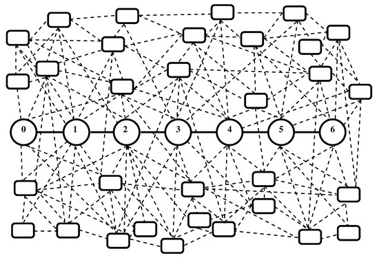We consider a channel in a network consisting of nodes connected by edges—Figure 1. We assume that the channel consists of a chain of nodes (labeled from 0 to N) connected by corresponding edges (ways for motion of the substance). Each edge connects two nodes and each node is connected to two edges except for 0-th node and N-th node which are connected to one edge. Some kind of substance moves through the nodes and edges of the channel.