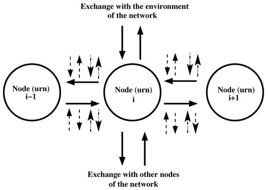 This motion is accompanied by processes of the exchange of substance between the channel, the rest of the network, and the environment of the network. The possible processes of exchange of substance for the i-th node of the channel are shown in Figure 2. One can image that an urn is placed in any of the nodes of the channel and in any of other nodes of the network and exchange of substance is among these urns. The i-th node can exchange substance with the -th and with -th nodes. The i-th node can also exchange substance with network nodes outside the channel and with the environment of the network. Let us denote as: (i) “leakage”—the process of motion of substance from a node of the channel to a node of the network or from a node of the channel to environment of the network; (ii) “inflow”—the process of motion of substance from a node of the network that does not belong to the channel or from the environment of the network to a node of the channel. The additional exchanges of substance connected to the flows between the i-th node and other nodes are shown in Figure 2 by arrows having dashed or dot-dashed lines. These exchanges are not accounted for by the previous models.
