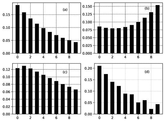 Several truncated distributions for a channel of 10 nodes connected to relationship (24) for the case of a fixed value of and different values of . has fixed value , for all figures. In addition, for all figures. (a) . (b) . (c) . (d) .
