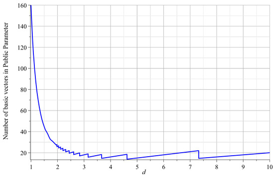 Since the public parameters are composed of multiple matrices, its size will directly affect the communication overhead in actual applications. As shown in this table, the public parameter in Agrawal’s construction [18] contains matrices. Zhang’s construction [23] achieves shorter public parameter at the cost of weaker security guarantees. In Yamada’s construction [22], the public parameter consists of matrices, where d is a constant. In Katsumata’s scheme [36], the public parameter consists of vectors because of ring setting. The relationship between the size of public parameters and constant d is shown in Figure 2. For , the minimum size of public parameters is 17 vectors when we set . Moreover, we need to set d very small (e.g., or 3) because of the reduction cost. If we set (resp. 3), the public parameters have 28 (resp. 20) vectors. In [24], the public parameter consists of matrices via new partitioning functions. In our construction, the public parameters only contain vectors, where . We have analyzed the choice of or in the previous part. For , the public parameter only contains 10 (resp. 18) vectors if we choose (resp. 10).