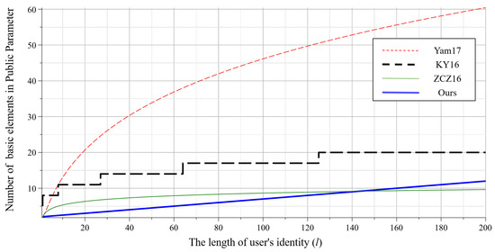 The comparison of public parameter size is shown in the Figure 3. It involves four IBE schemes with short public parameters, including Yam17 [24], KY16 [36] (), ZCZ16 [23] and ours (). The x-axis represents the length of user’s identity, and the y-axis represents the number of basic matrices (or vectors) in the public parameters of each scheme. Obviously, the public parameters in our scheme are shorter than [24] and [36]. Moreover, it can be shorter than [23] if the identity length l is small (e.g., less than 140).