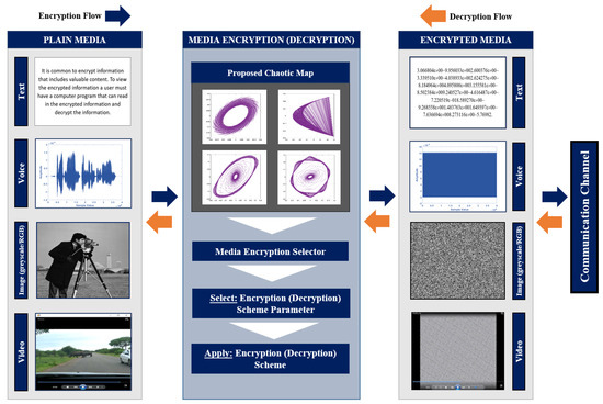 Most of the research work aims at providing improved encryption quality, less execution, and security robustness against attacks. Compared with traditional encryption schemes, chaos-based schemes have demonstrated outstanding performance with proven ability of increased security and privacy needed by utilizing variable keys [3,4,5,6,7]. The basis is to use many components of chaos to decorate confusion and diffusion abilities of a given scheme [8]. In literature, chaos-based encryptions span a wide spectrum of multimedia types, i.e., text, audio, image, and video. Next, an overview of the recent literature work on a chaotic maps-based multimedia encryption application is provided.