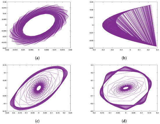 Generally, distribution uniformity of chaotic behavior and the span of the parametric space of given chaotic maps can be examined using specific diagrams (i.e., bifurcation diagrams) to assure their suitability for the field of multimedia encryption [8]. Moreover, chaotic maps dynamics are specified by orbits, which are characterized via a non-smooth and discontinuous movement, see Figure 2. As may be effectively seen from the plots, each map exhibits a unique signature. The balance focuses on the introduced finance model are gotten via fathoming the above structures of equations. The characteristic types of the modified finance models can be achieved by Algorithm 1 using the control parameters, , and . The above maps are used for various multimedia encryption (image, video, audio, and text), which are discussed in the following subsections.