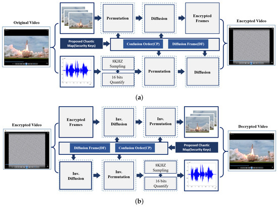 Schematic of the proposed video encryption (a) and decryption (b) stages.