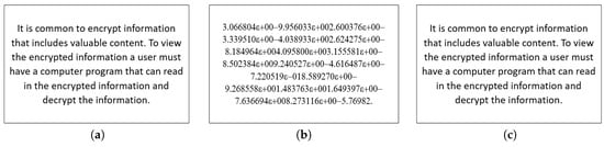 Step-by-step illustration of the text simulation results: (a) plain (b) encrypted, and (c) decrypted text data.