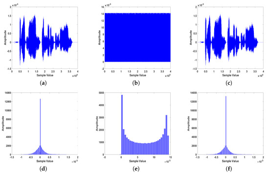 Sample example of the encryption/decryption results obtained using the proposed voice encryption approach: (a) original, (b) encrypted, and (c) decrypted signals. Signals’ histograms are shown in (d–f), respectively.
