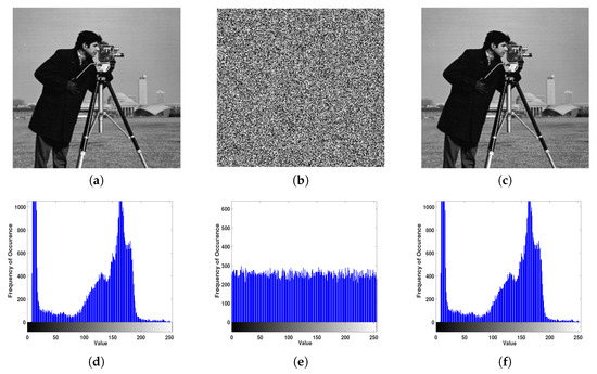 Encryption and decoding example results using the Cameraman image: (a) plain, (b) encrypted, and (c) decrypted images. Respective image histograms are shown in (d–f).