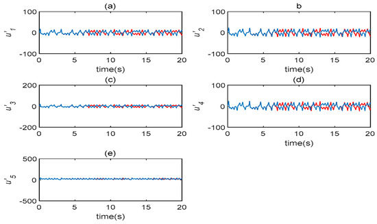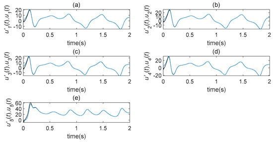 In terms of its sensitivity to initial values, a time-delay complex Lü chaotic system can be analyzed. Let and select two very similar initial values, such as and . The evolution diagrams of five state variables are shown in Figure 1, which demonstrates that the time-delay system is highly sensitive to the initial state value. The following transformation is introduced to system (3): ; under this, system (3) remains unchanged. As a result of this, system (3) is symmetrical with respect to ; this symmetry is true for all parameters.