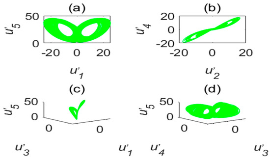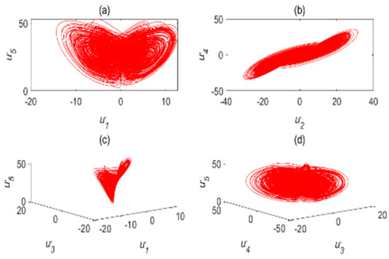 where , are complex variables, is the real state variable, and are constants. By separating the real and imaginary parts of the system equation, a five-dimensional chaotic system of equations can be obtained, as follows: