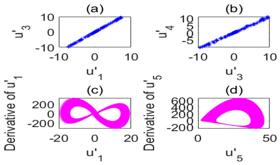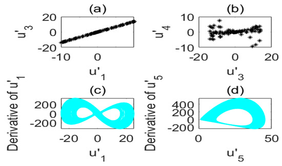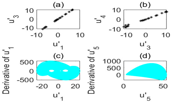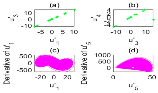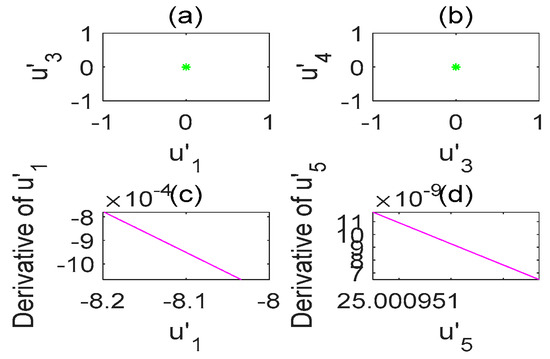 Therefore, the divergence of system (2) can be expressed as , , where the system is dissipative and converges in exponential form, . In fact, the volume element of the initial volume V(0) becomes at time T. When , each small volume element—including the trajectory of system (3)—converges to zero at an exponential rate and its motion is fixed on an attractor, which indicates that there exists an attractor in system (3).