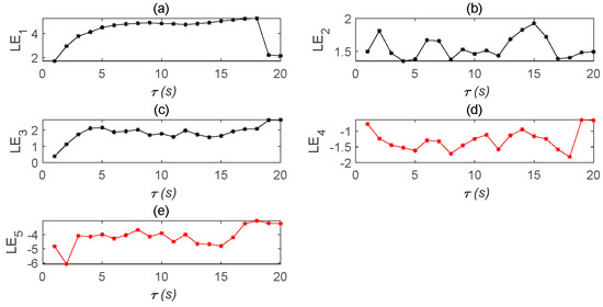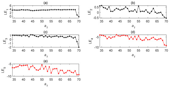 Lyapunov exponent diagram of the time-delay complex Lü system with parameter . (a) Lyapunov exponent diagram of state variable changing with ; (b) Lyapunov exponent diagram of state variable changing with ; (c) Lyapunov exponent diagram of state variable changing with ; (d) Lyapunov exponent diagram of state variable changing with ; (e) Lyapunov exponent diagram of state variable changing with ().