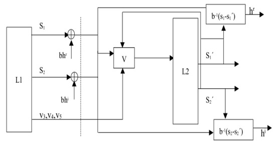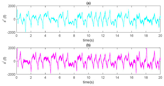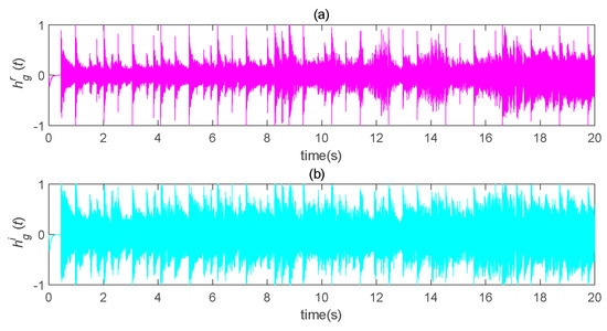 Figure 11 shows a block diagram of our communication scheme. At the sending end of the speech transmission, cheerful “Traveling” music was selected as the audio signal, the L1 system was used as the encrypted voice signal, and the L2 system was used as the decrypted voice signal. The transmitted signals were related to all parts of the master system and information signal. There is no longer a need to transmit each information signal using a separate channel. The transmitted signals are the state variables of the main system and the linear equations are encrypted to improve the security of communication. The transmission signal at the sending end is expressed as , , where are the information signals and b is the parameter. The superscripts r and i stand for the real and imaginary parts of the complex vector, respectively. The signals at the receiving end are a linear combination of the variables of the master system and the slave system, expressed as and , respectively. The controller (17) evolved from the STDS controller (12) is used as our speech communication controller: