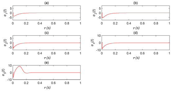 Self-time-delay synchronization error status analysis diagram. (a) error analysis chart of and changing with time; (b) error analysis chart of and changing with time; (c) error analysis chart of and changing with time; (d) error analysis chart of and changing with time; (e) error analysis chart of and changing with time.