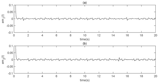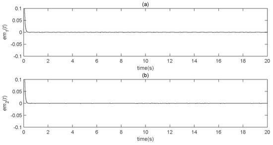 The complex Lü system (2) was taken as the master system and the double time-delay complex Lü system (11) as the slave system. The initial values of the system were and , while the time-delays were . The controller of system (12) was adopted, where , , and . The STDS state error graph was obtained, as shown in Figure 12. The effect of this simulation was better. The error tended to be zero and the simulation results were basically consistent with the mathematical analysis, verifying the effectiveness of the controller.