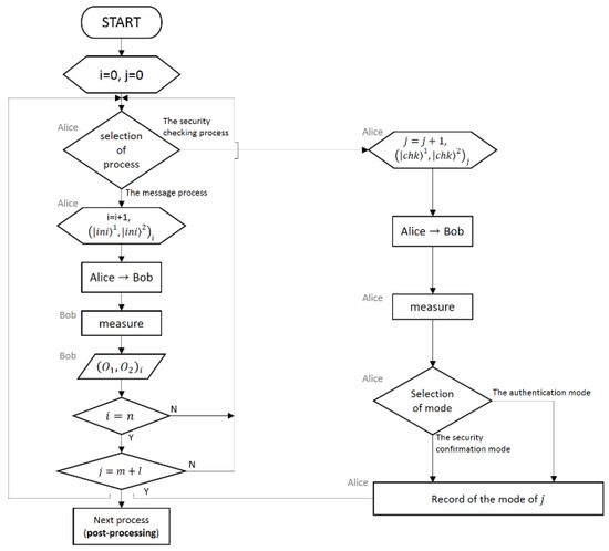 - Alice selects either the authentication mode or the security confirmation mode with the specified probability. In other words, Alice chooses the authentication mode with the probability and the security confirmation mode with the probability . At this time, the process must be iterated from step 1 to the current step until the number of pairs of the authentication mode is . Alice securely records the mode of her own choosing. Go to Step 1.