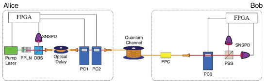 We next demonstrate the proposed DSQC protocol using a heralded single-photon source and polarization qubits. The schematic of our DSQC system is shown in Figure 3. Alice encodes a polarization state into a single photon generated by spontaneous parametric down-conversion (SPDC) in a 10 mm-long type-I PPLN crystal, pumped by a 520-nm mode-locked laser (40 MHz repetition rate). The PPLN crystal emits 782 nm idler photons and 1552 nm signal photons, and the idler photons are detected by a trigger superconductor nanowire single photon detector (SNSPD). The SNSPD has >80% detector efficiency and less than a 100 Hz dark count at 1550 nm. The polarization state of the 1552 nm signal photon is encoded by two Pockels cells. Bob receives the signal photon after transmission through a single mode fiber (SMF28e) line. The measurement basis is randomly chosen by one Pockels cell using either the or basis along with a polarization analyzer and two SNSPDs. For Alice and Bob, the data process and Pockels-cell driving signals are separately controlled by a field-programmable gate array module (FPGA). The heralding efficiency of the heralded single-photon source is 45% for 1552 nm signal photons, for which the count rate is 400 kHz. The second-order correlation of the heralded single photons is .